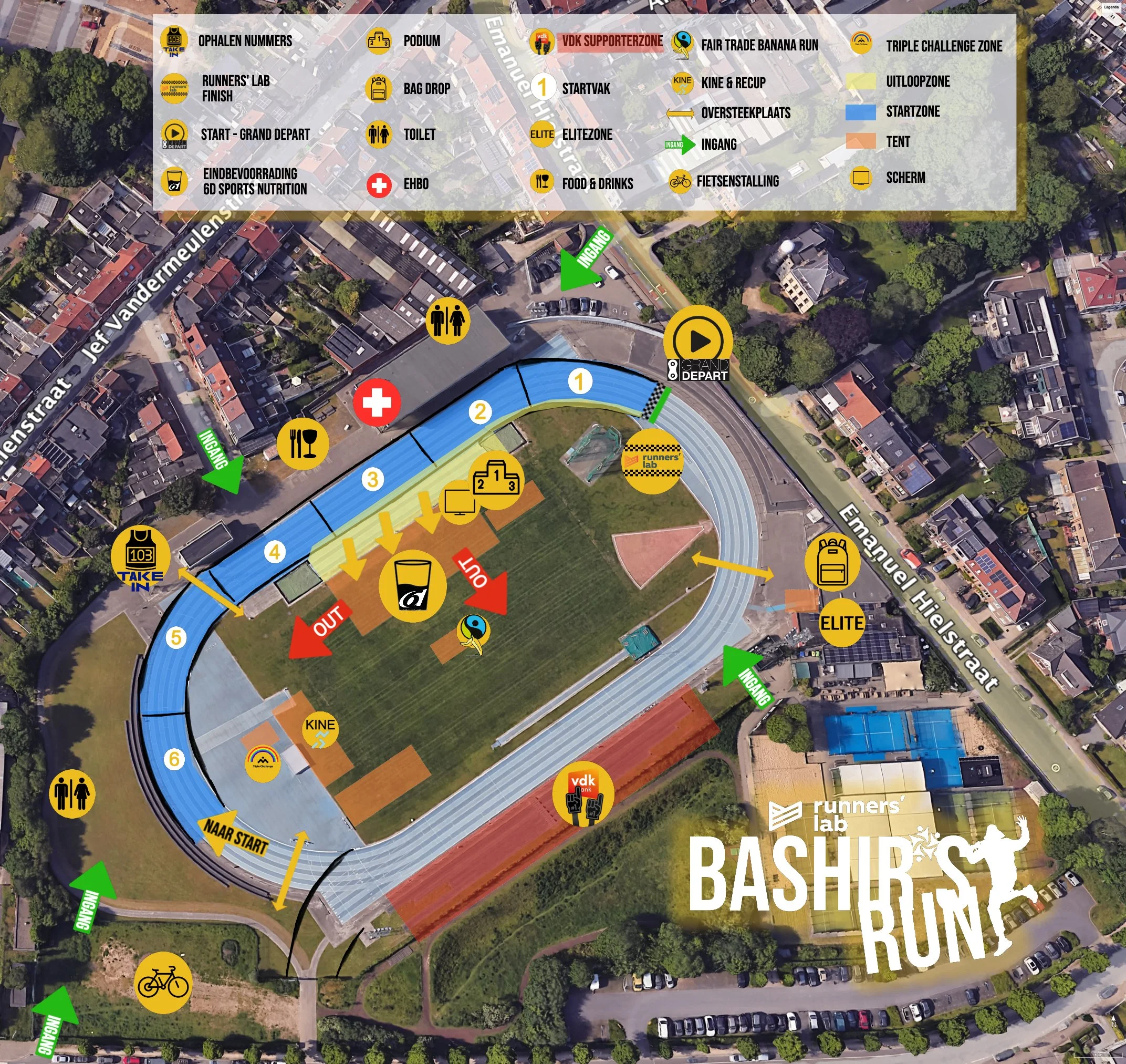 Let op: de 5 en 10 km starten niet in het stadion (zie parcours). De aankomst is wel in het stadion.